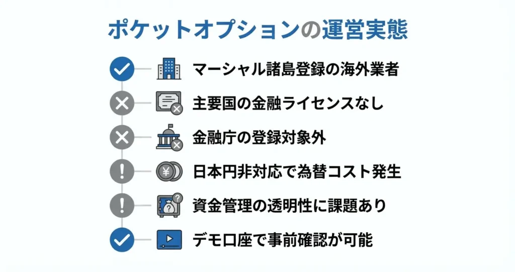 ポケットオプションを利用する前に、まず確認すべきはサービスの運営実態と法的な位置づけです。