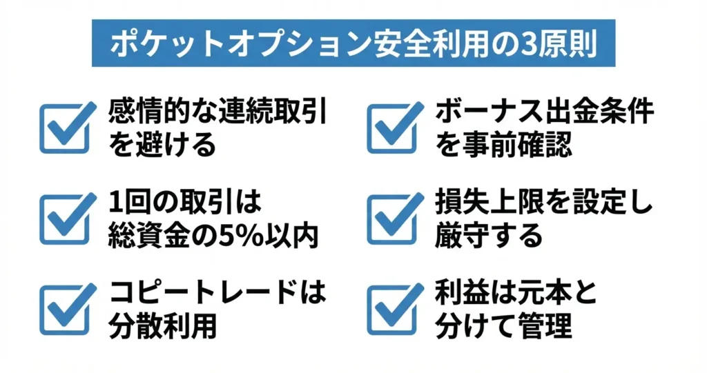 これらのルールを守ることで、ポケットオプションを含むどの業者を利用する場合でも、損失を管理可能な範囲に収めながら取引経験を積むことが可能になります。