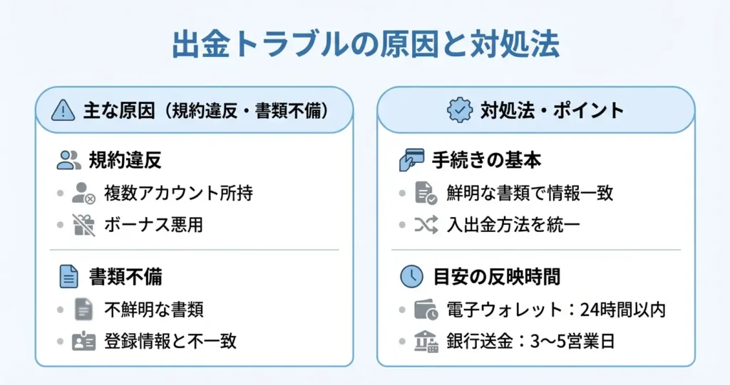 ここまでの評判を踏まえたうえで、次は実際の出金トラブルの実態と対処法を詳しく見ていきましょう