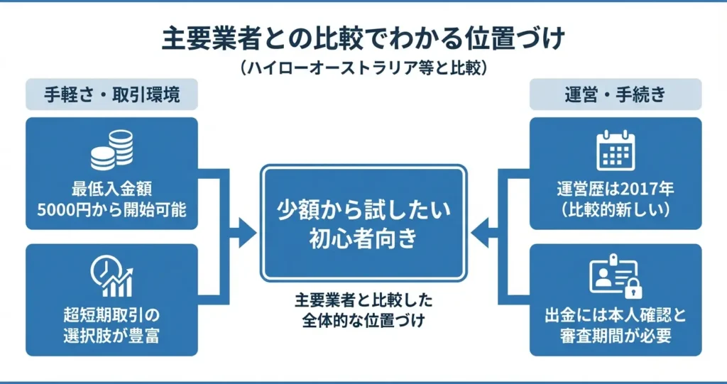 逆に、長期的な運営実績や日本国内での認知度を重視する利用者、または高額取引を前提とした本格的な運用を考えている層にとっては、ハイローオーストラリアなどより実績のある業者を優先する方が判断しやすい可能性があります。