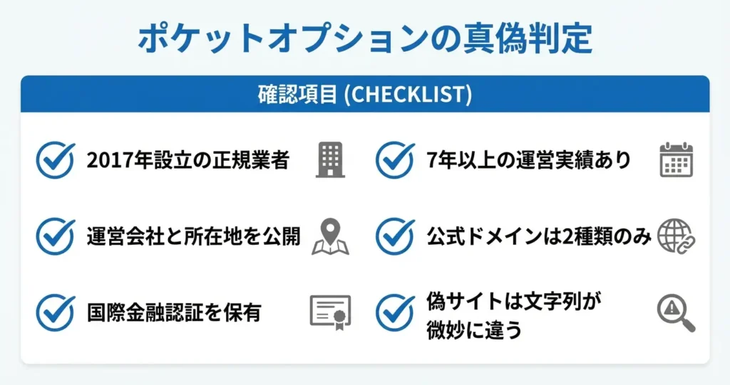 結論から言えば、ポケットオプションは実在する正規のバイナリーオプション業者です。このセクションでは、その判断根拠となる客観的な事実と、偽サイトとの見分け方について整理します。