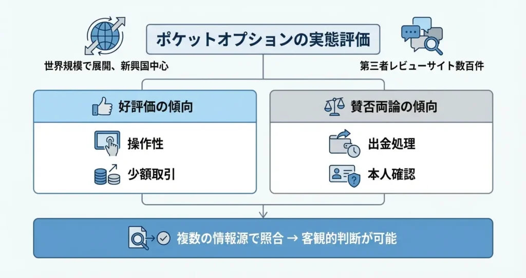 ここでは第三者の口コミや利用状況をもとに、ポケットオプションの実態を多角的に検証します。評判を確認することで、正規業者として機能しているかどうかをより具体的に判断できます。