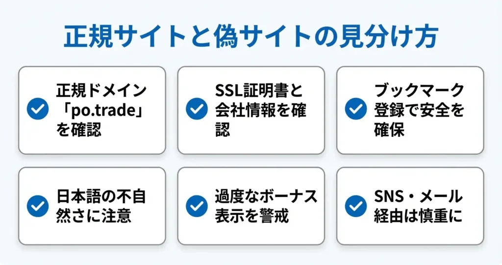 公式サイトのドメインは「po.trade」または「pocketoption.com」であり、これ以外のドメインでポケットオプションを名乗るサイトは模倣サイトやフィッシングサイトの可能性があります。
