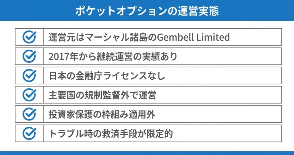 ポケットオプションが本物の業者かどうかを判断する上で、運営会社の実在性と保有する金融ライセンスは最も重要な確認事項です。