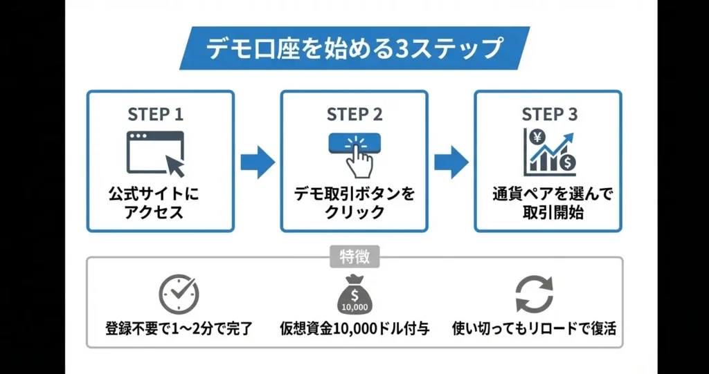 ここでは実際の画面操作に沿って、デモ取引を開始するまでの手順を3つのステップで解説します。初めて利用する方でも、この流れに従えば1分から2分程度でデモ取引を開始できます。