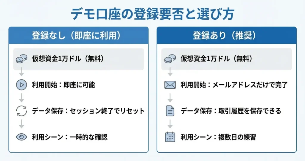 アカウント登録を行うと、デモ口座の取引履歴や設定内容がサーバー上に保存されるため、どのデバイスからアクセスしても同じ環境で練習を継続できます。