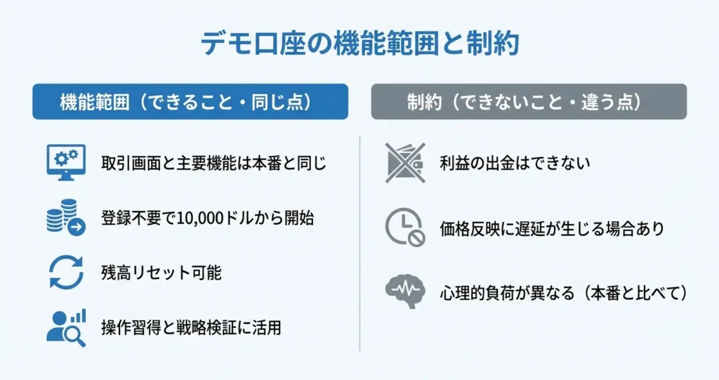 デモ口座では本番口座と同じ銘柄・チャート・分析ツールが利用できますが、出金操作や一部のキャンペーン機能は体験できません。
