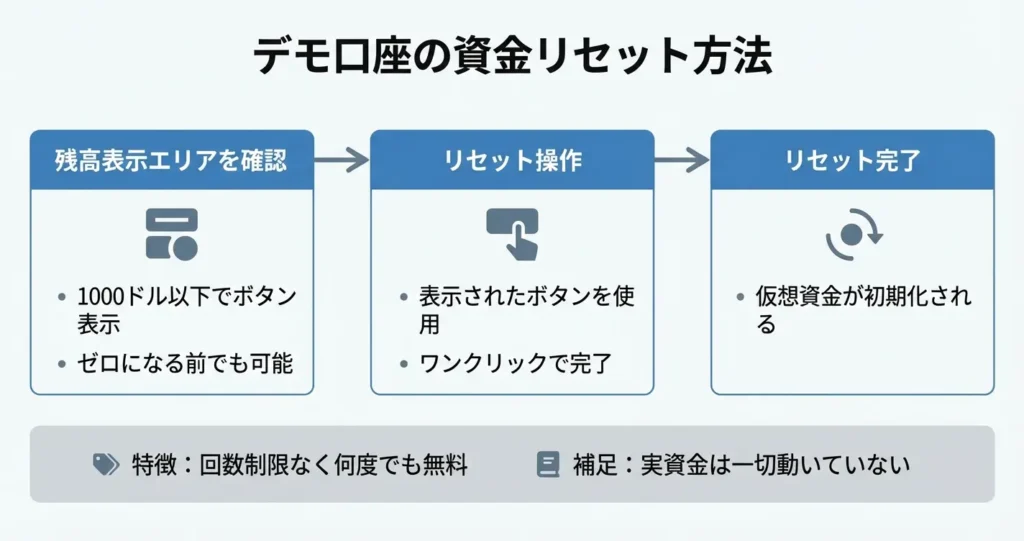 デモ口座の残高は初期値に何度でもリセットできる仕組みになっています。