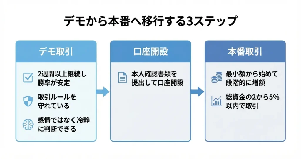 このセクションでは、デモを卒業する判断基準と、本番口座へ安全に移行するための具体的なステップを解説します。適切なタイミングで移行することで、デモで培った技術を実際の取引で活かすことができます。
