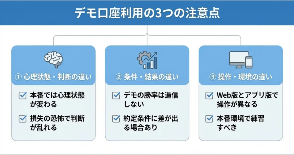 デモ口座は無料でリスクなく練習できる便利な環境ですが、実際の取引との違いを理解しておかないと、本番で思わぬ失敗につながる可能性があります。