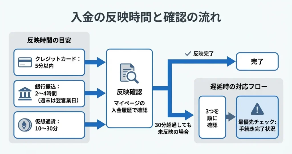 万が一入金が反映されない場合は、マイページの入金履歴から手続き状況を確認し、30分以上経過しても反映されないときはサポートへ問い合わせることで対処できます。