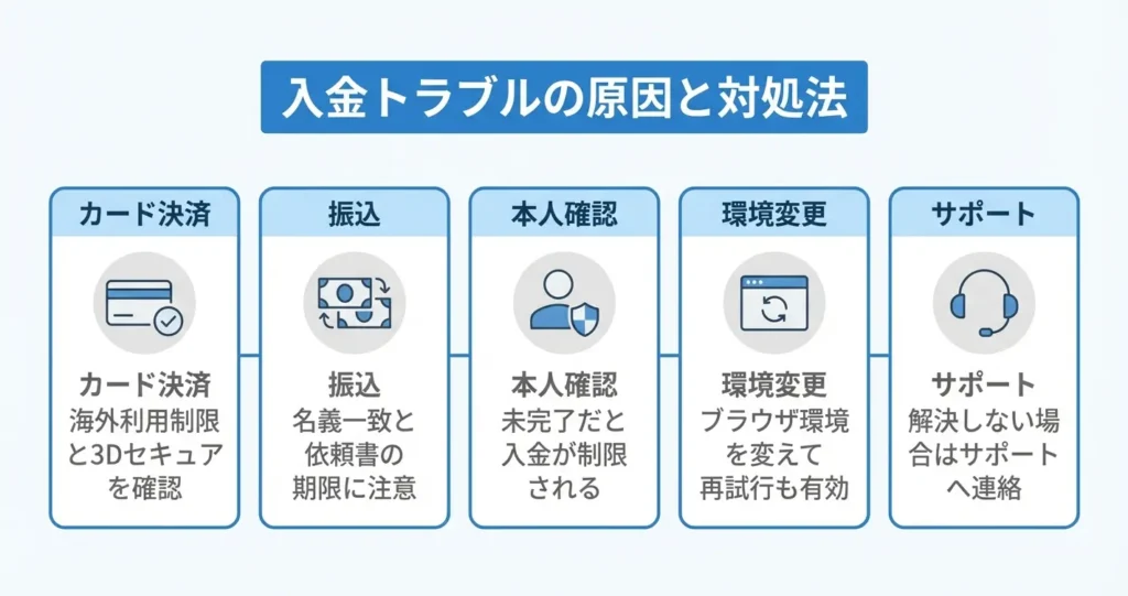 入金に関するルールを理解したら、次は実際に入金を進める際に起こりうるトラブルとその対処法を確認しておくと安心です。