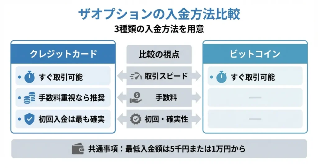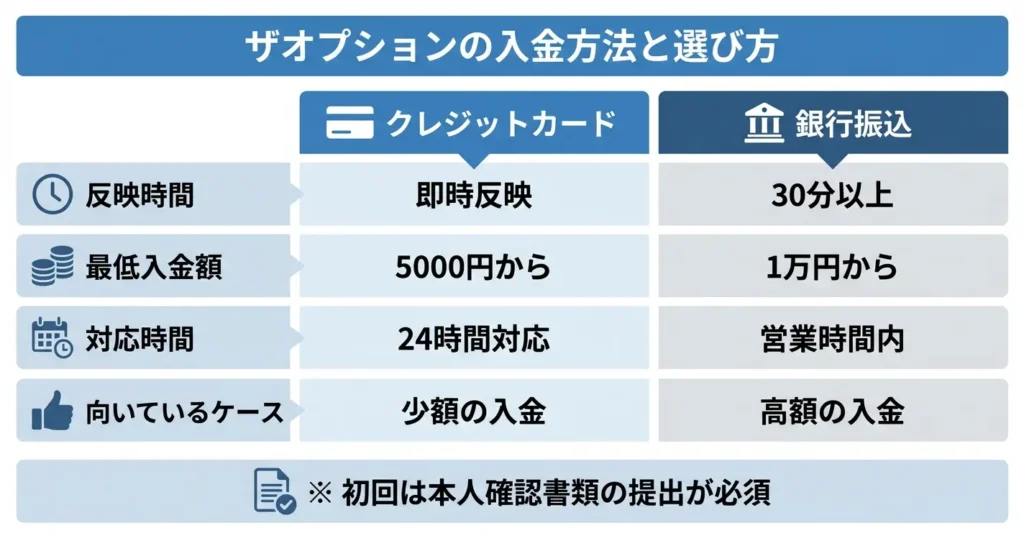 ザオプションには複数の入金方法が用意されており、それぞれ反映時間や手数料、利用条件が異なります。