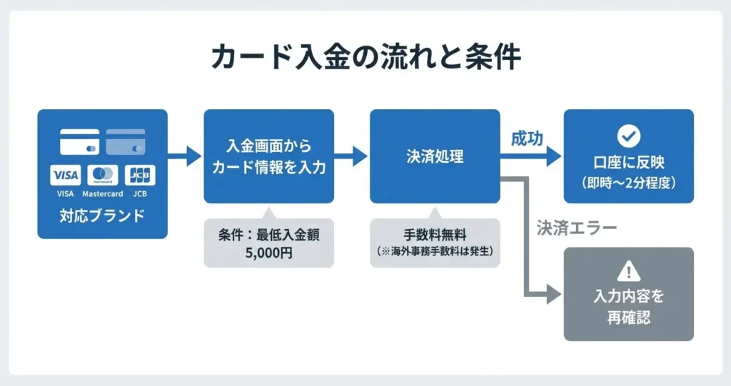 VISA、Mastercard、JCBの国際ブランドに対応しており、入金手続き完了後、通常は数分以内に取引口座へ反映されます。