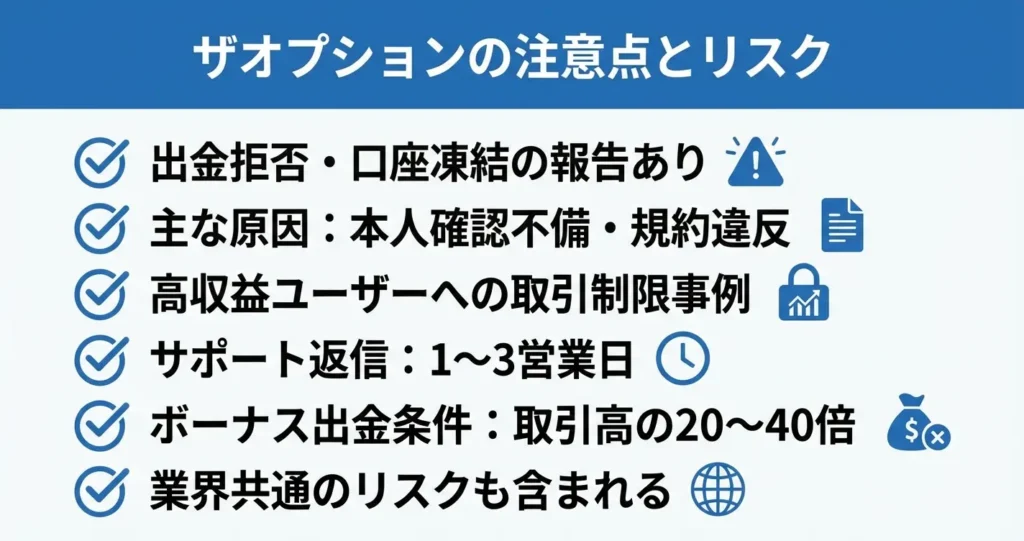 こうした制限リスクは海外バイナリーオプション業者に共通する課題であり、ザオプション固有の問題ではない点も理解しておきましょう。
