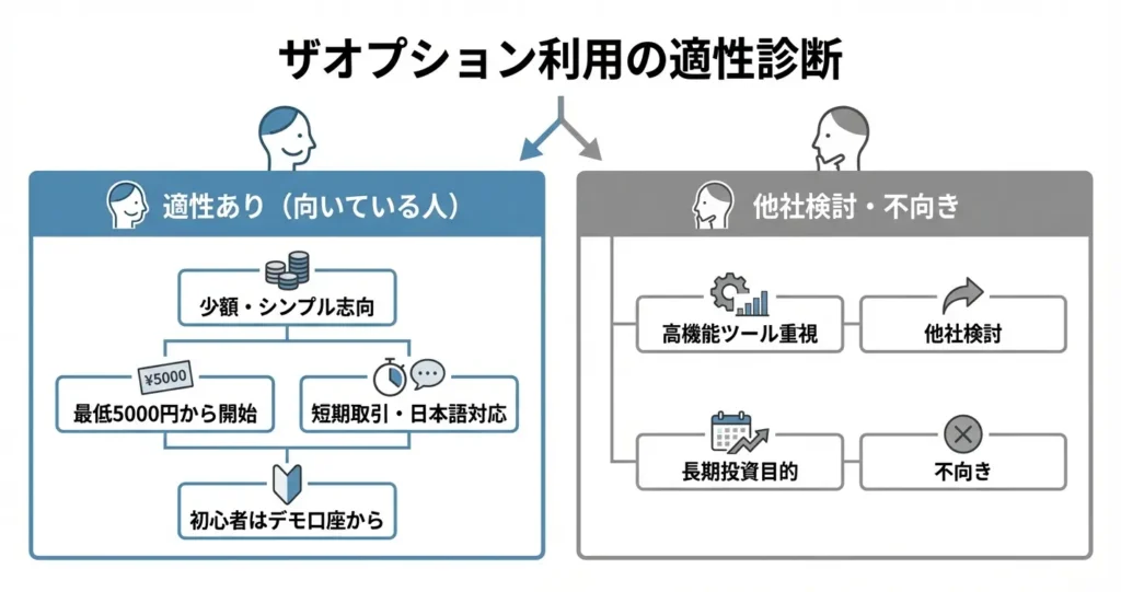 ここでは客観的な比較情報をもとに、ザオプションがどのような利用者に適しているかを整理します。