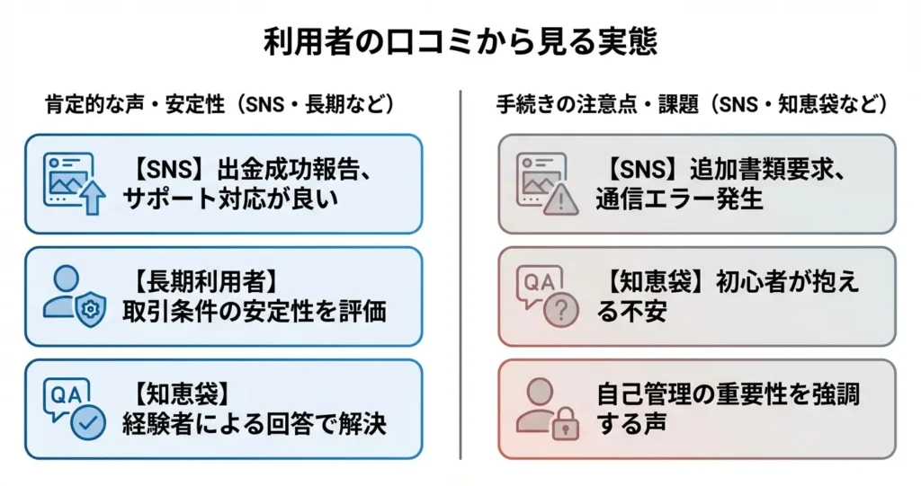 正当な取引を行い、必要な手続きを完了している利用者からは出金トラブルの報告は大半が解決済みとして扱われており、規約を守った利用では問題なく出金できるケースがほとんど。