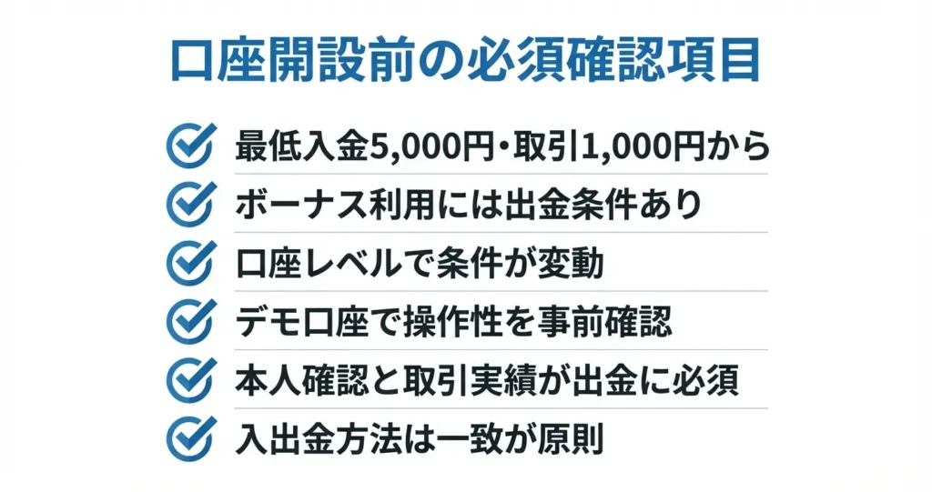 口座開設を実行する前に、以下の項目を確認しておくことで後々のトラブルを防げます。