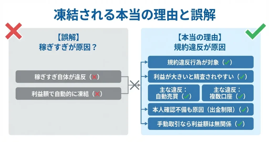 ここでは、誤解されやすい「稼ぎすぎ」の実態と、実際に凍結リスクとなる行為の全体像を整理します。