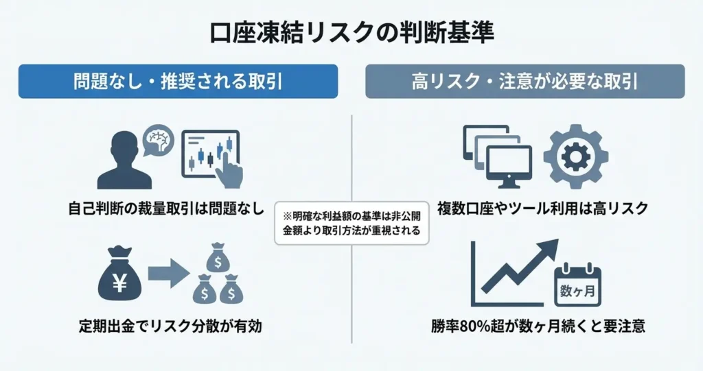 利益額そのものではなく、取引方法に問題がある場合に凍結リスクが高まることを理解しておく必要があります。