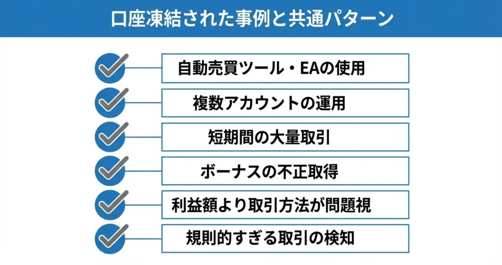 利益が出ている状況で不安を感じる場合、次に知っておくべきは実際にどのような理由で凍結や制限が発生しているかという事例です。次のセクションでは、具体的な凍結事例とその背景を見ていきます。