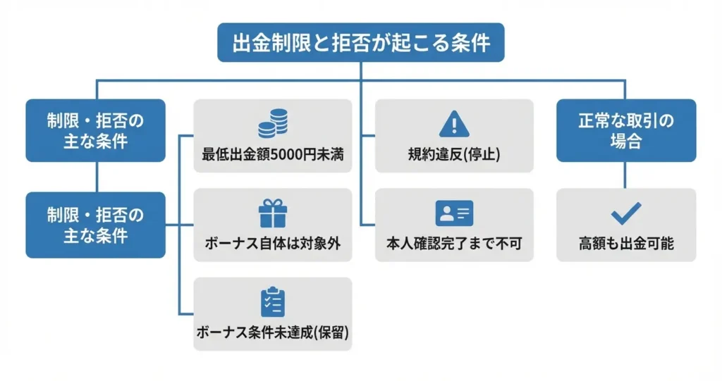 出金制限や出金拒否が発生するケースとしては、以下のような場合が該当します。