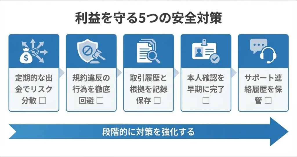 次のセクションでは、こうした凍結リスクを避けながら、安全に利益を出し続けるための具体的な対策を確認していきます。