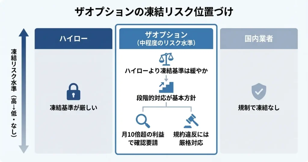 比較を通じて見えてくるのは、ザオプションが極端に凍結リスクが高いわけでも低いわけでもなく、海外業者としては中程度の水準にあるという点です。