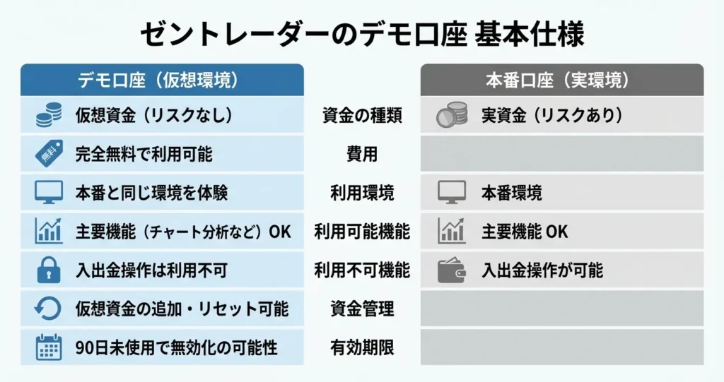ゼントレーダーのデモ口座は、仮想資金を使って本番と同じ取引環境を体験できる練習用の口座です。登録料や利用料は一切かからず、完全無料で利用できます。