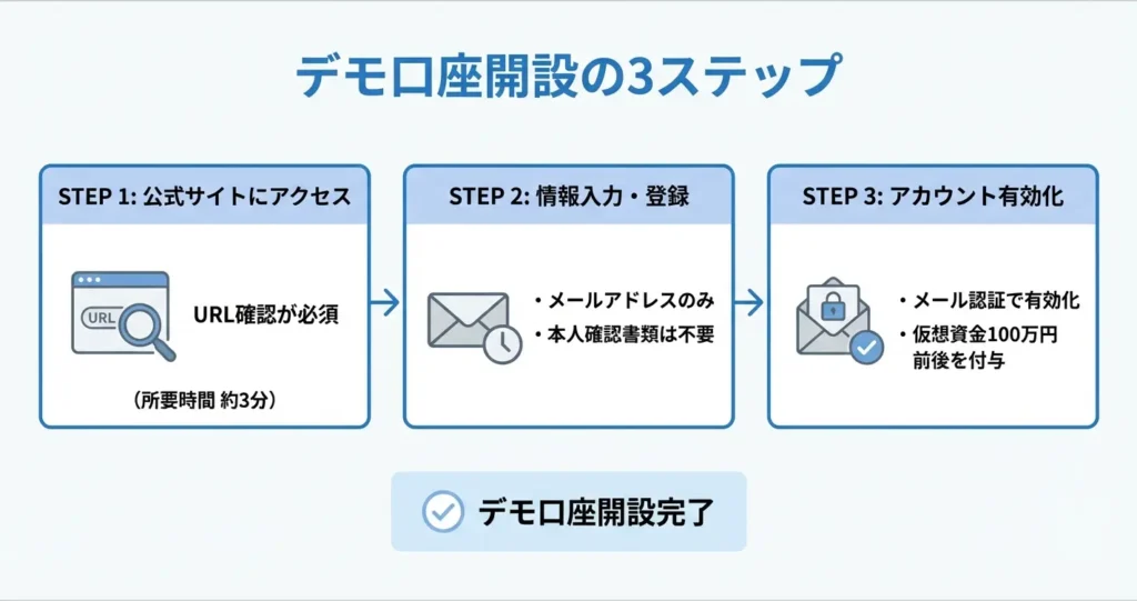 デモ口座の開設にはメールアドレスなど最小限の情報登録のみで、本人確認書類は不要です。登録は数分程度で完了し、すぐに取引の練習を始められます。