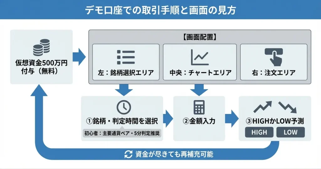 デモ口座は完全無料で、500万円前後の仮想資金を使い、何度でもリスクなしに取引を試すことができる