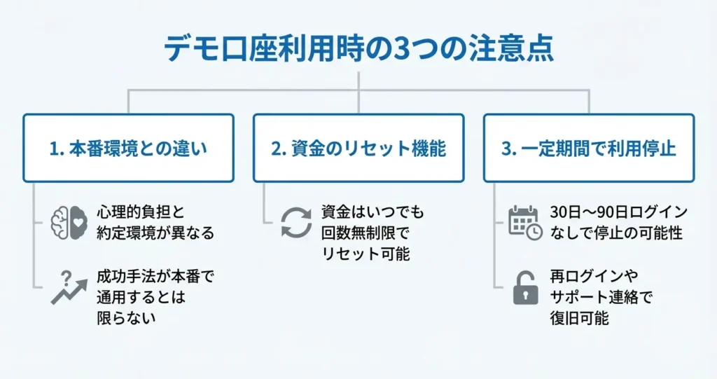 デモ口座は操作方法の習得や戦略の検証が主な目的であり、本番での成績を保証するものではない点に注意が必要です。
