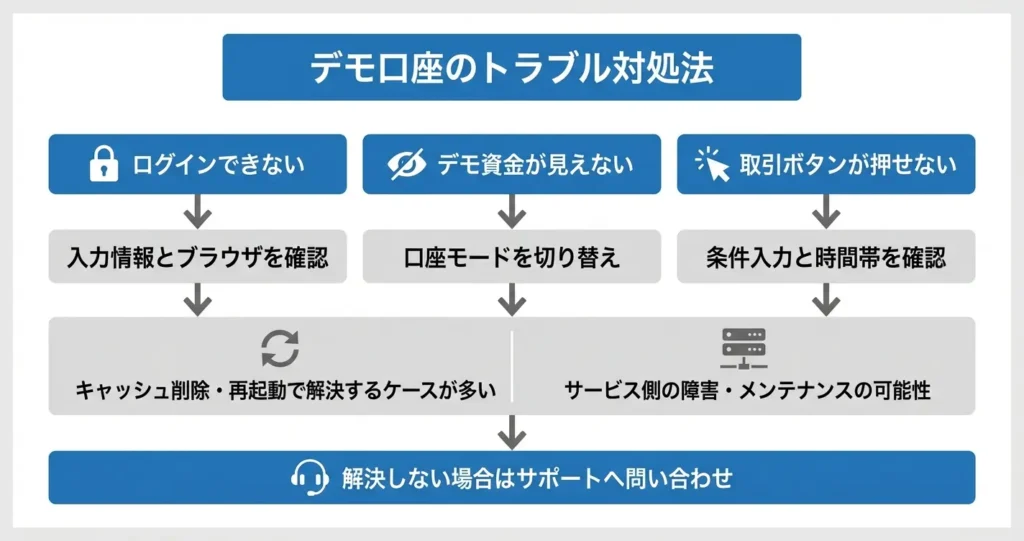 デモ口座のトラブルは、入力情報・ブラウザ設定・口座切り替えなど基本的な確認で解決できることがほとんどです
