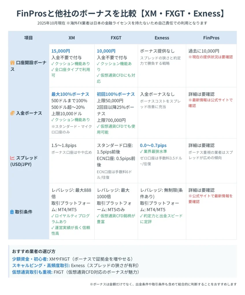 この記事では、FinProsのボーナスに関する2025年10月最新の提供状況から、過去に実施されていた口座開設ボーナス・入金ボーナスの詳細内容、XM・FXGT・Exnessとの徹底比較、さらに受け取り方法や出金条件まで全てを網羅的に解説します。
