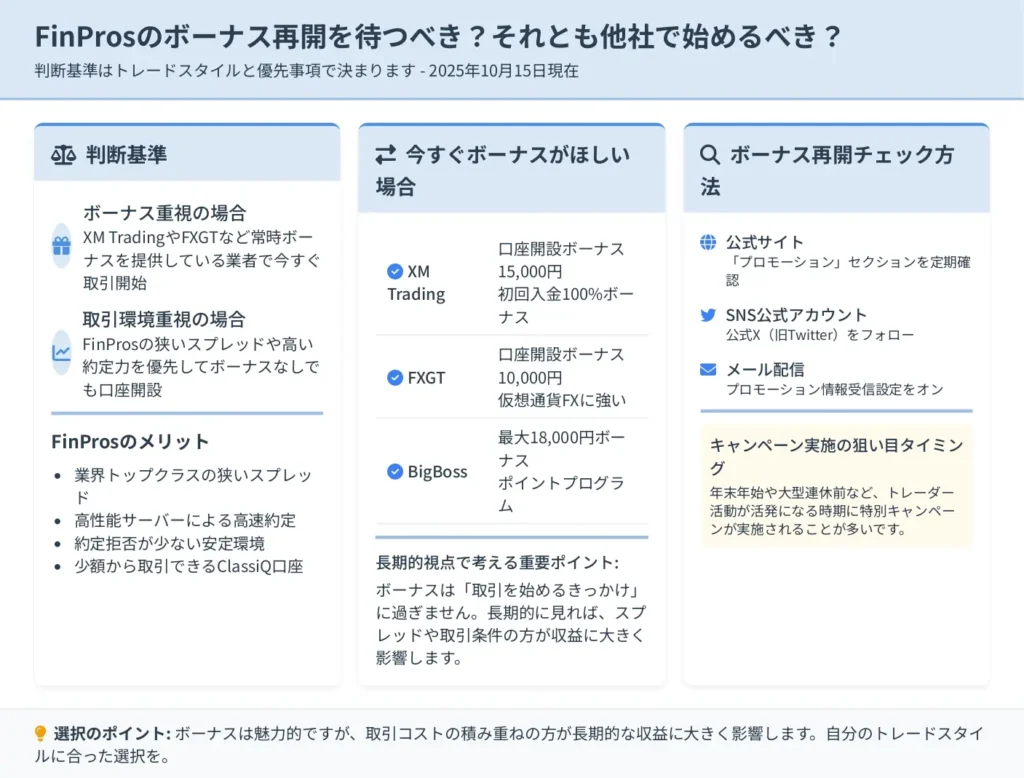 同時にFinProsの公式情報もチェックし、ボーナス再開時には追加で口座開設することで、より多くの選択肢を確保できます。