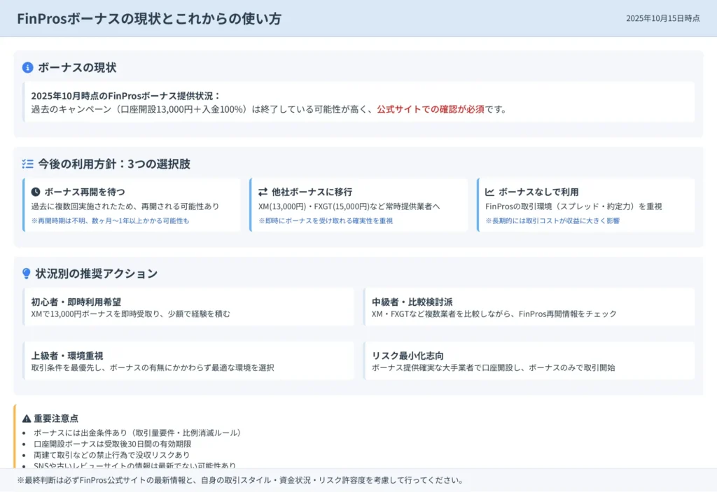 その間にFinProsのボーナス再開情報を収集し、再開後に追加で口座を開設するのが最もリスクの少ない方法です。
